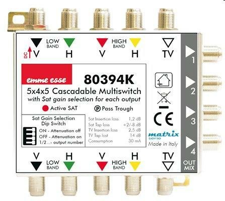 Ciascun modello è disponibile nella versione attiva sulle frequenza Sat (passiva per i segnali TV) passante e terminale, oppure passiva con due diversi valori di attenuazione sat e TV. Agendo sugli appositi dip switch è possibile attenuare di 10 dB il segnale satellite in modo indipendente per ogni uscita. Questa soluzione consente di livellare i segnali sat su tutte le prese anche se collegate allo stesso multiswitch.